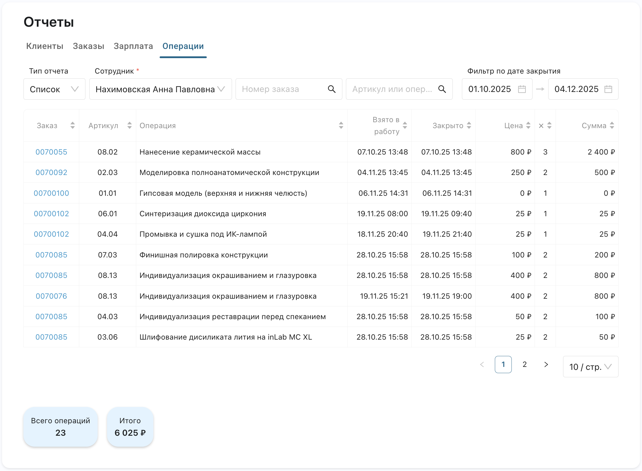 Видно, на каких конкретно заказах работал сотрудник.
