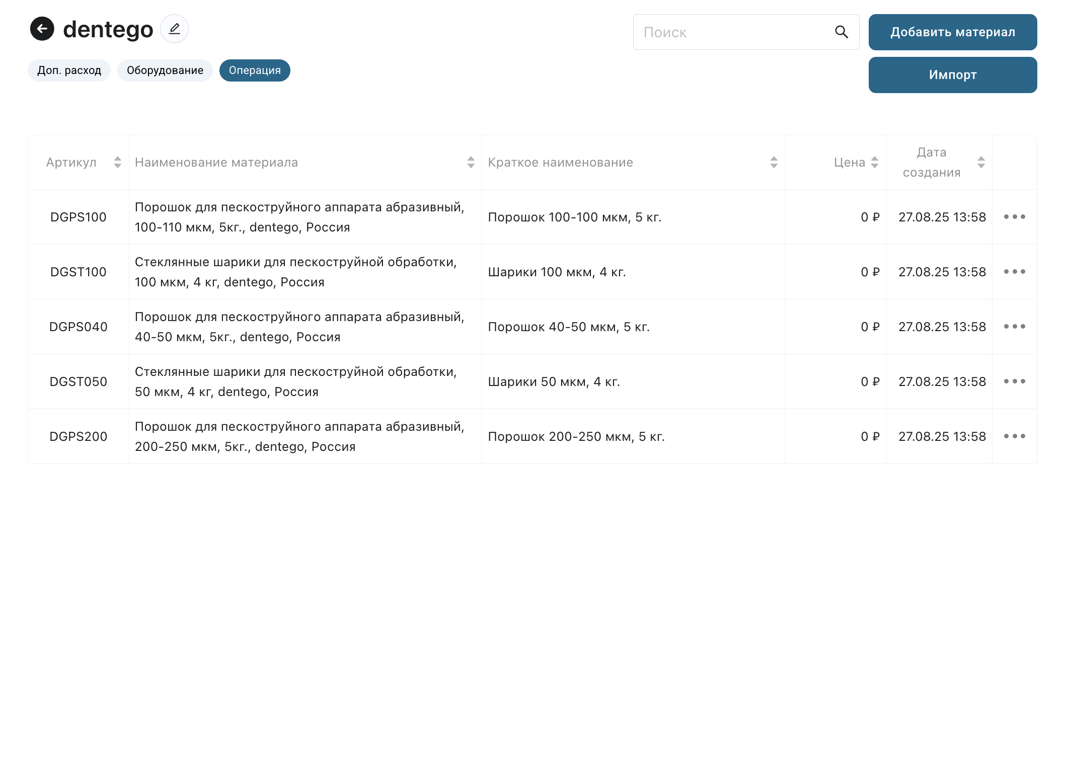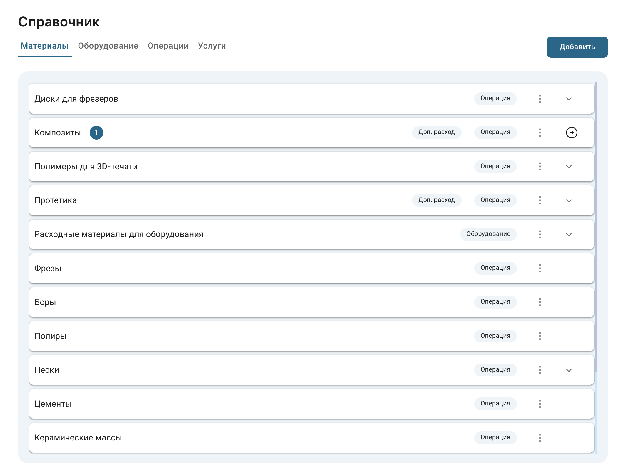 Материалы — это всё, что расходуется в работе: диоксид циркония, керамика, фрезы, красители. Правильная настройка материалов обеспечивает точный учёт расходов и себестоимости.