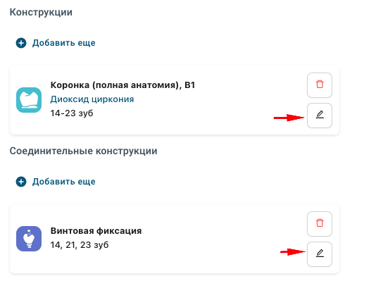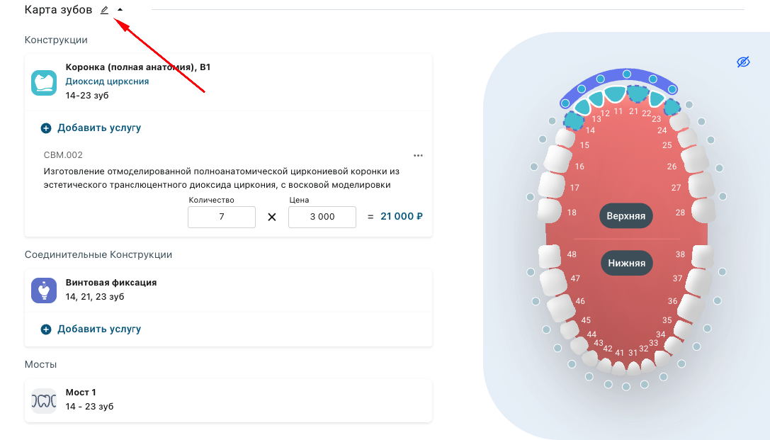 - В уже созданном заказе — откройте заказ и нажмите на иконку карандаша напротив заголовка «Карта зубов»