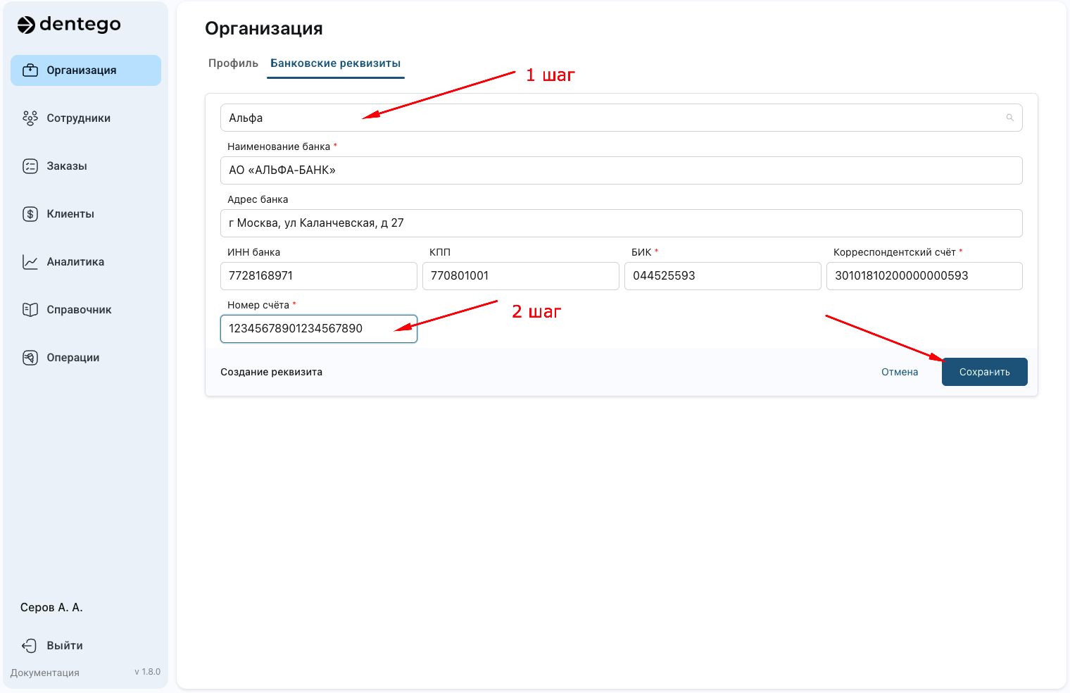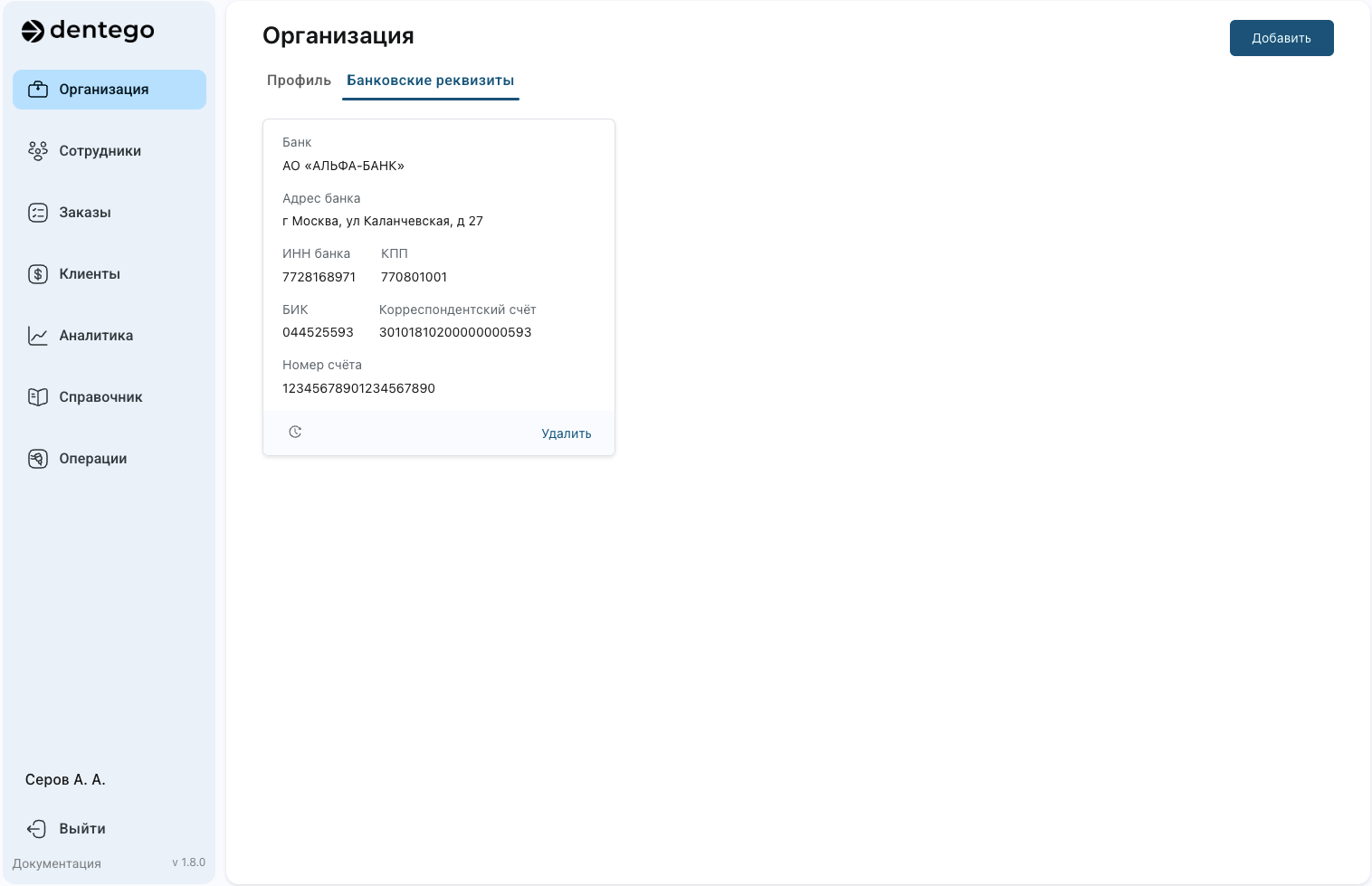 Вкладка «Банковские реквизиты» позволяет управлять банковскими данными для получения оплаты от клиентов.