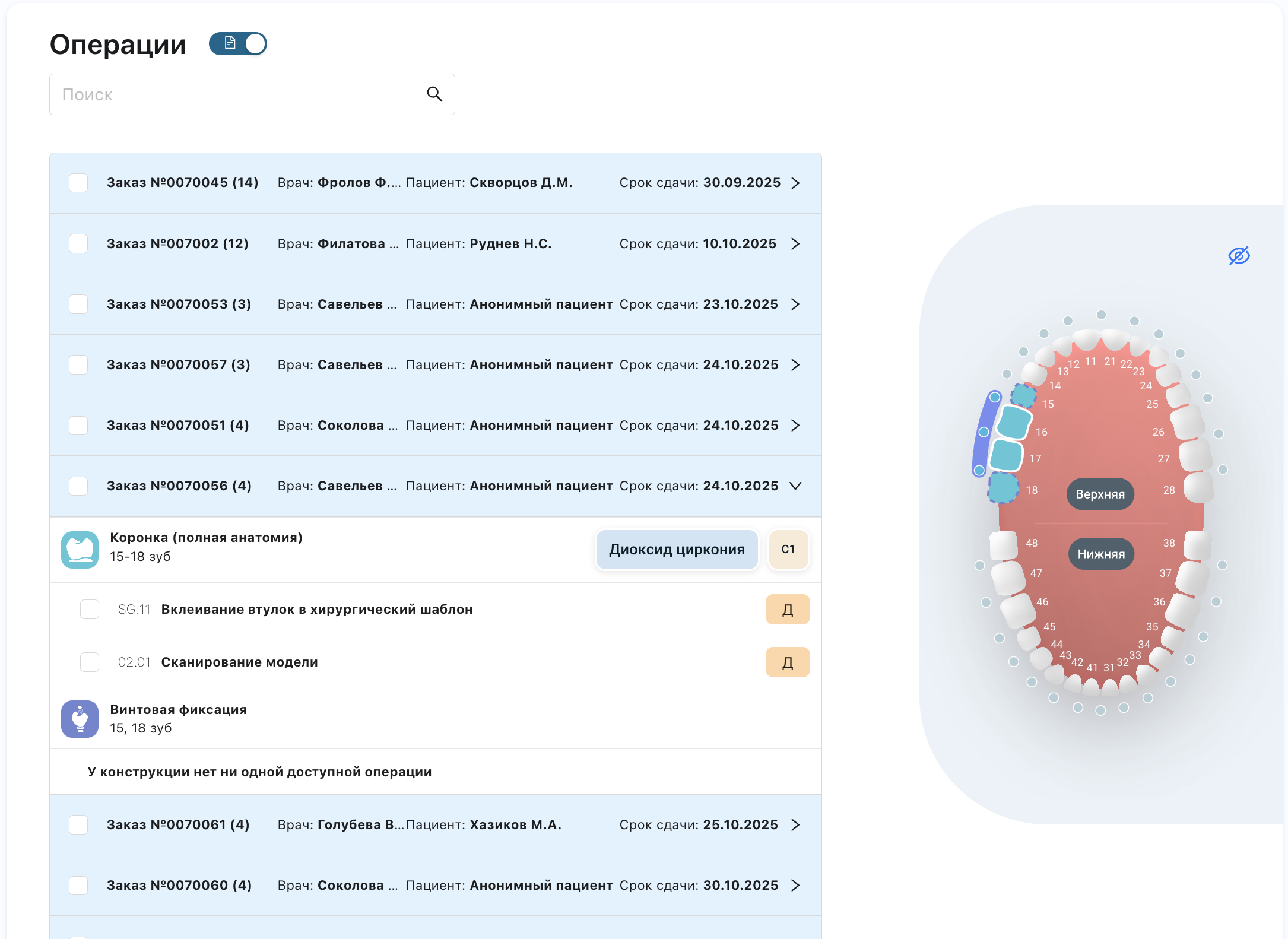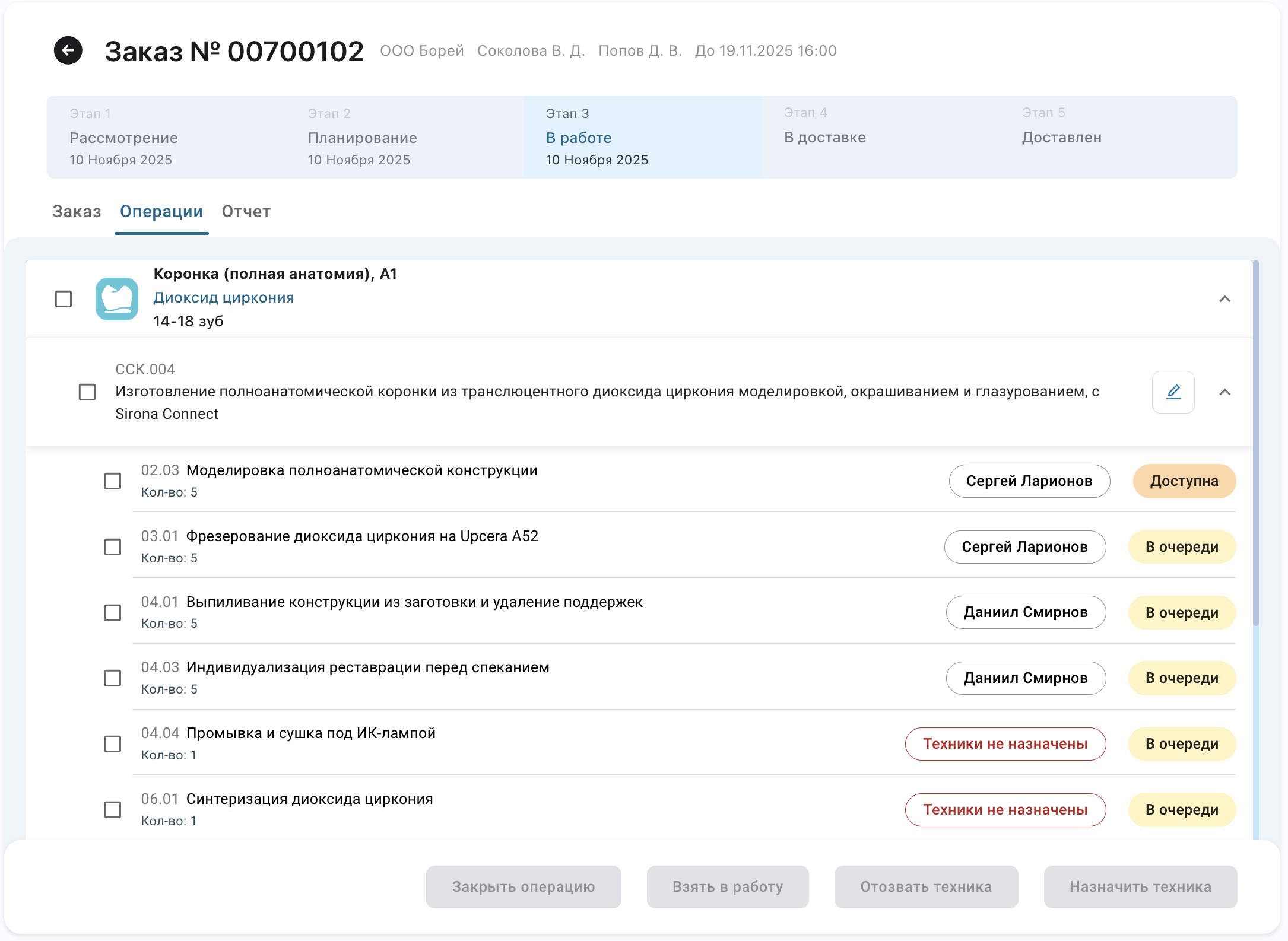 При добавлении услуги к конструкции автоматически создаются операции — задачи для техников. Каждая услуга содержит одну или несколько операций. Например, услуга «Полная анатомия» может включать операции: моделировка, фрезеровка, синтеризация и т.д. Именно эти операции техники будут выполнять и закрывать.