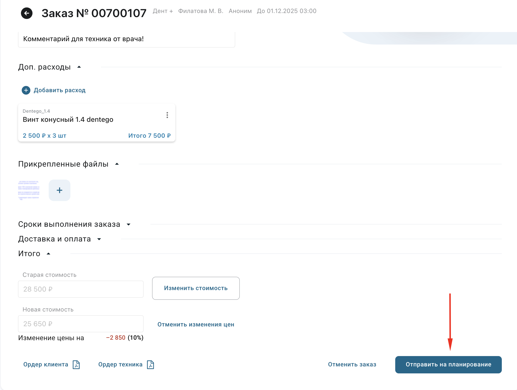 После добавления услуг нажмите «Отправить на планирование» внизу страницы заказа: