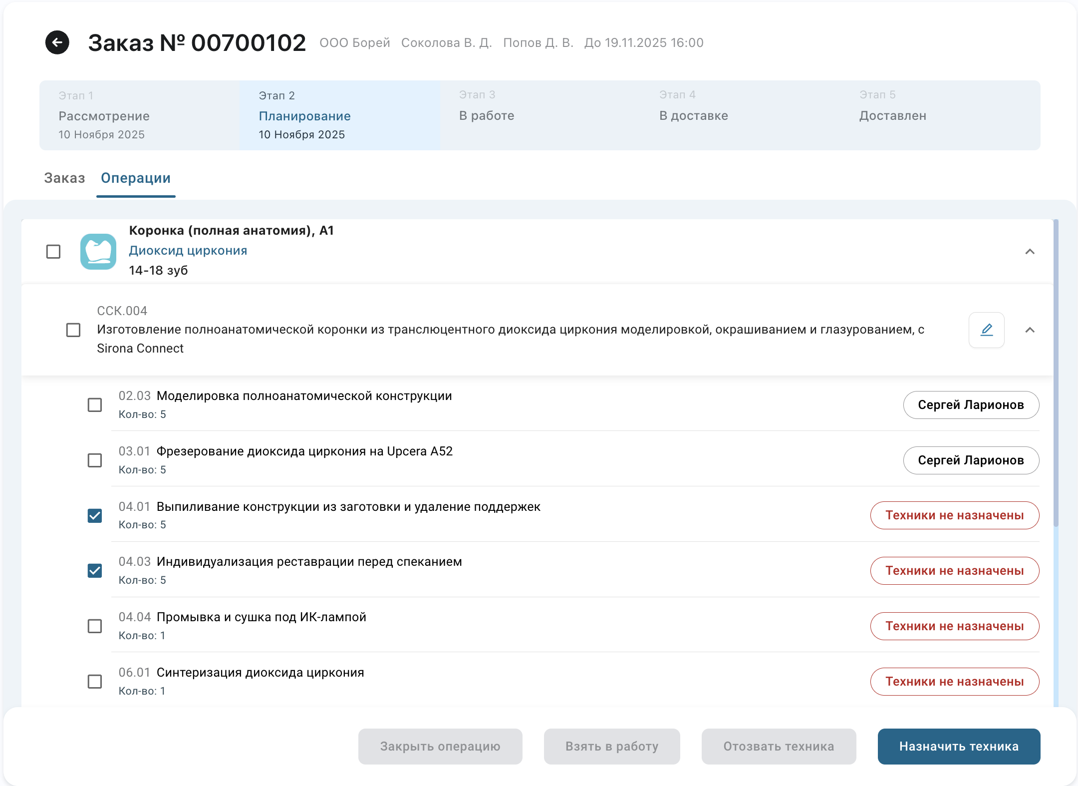 3. Планирование Назначение техников на операции (необязательно)