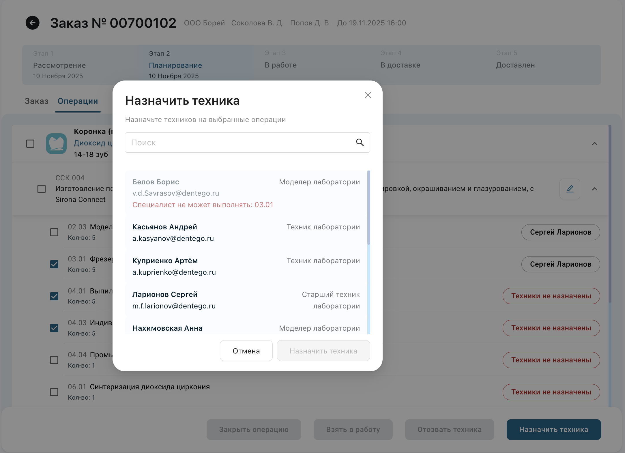 Назначьте техников на все операции заказа.