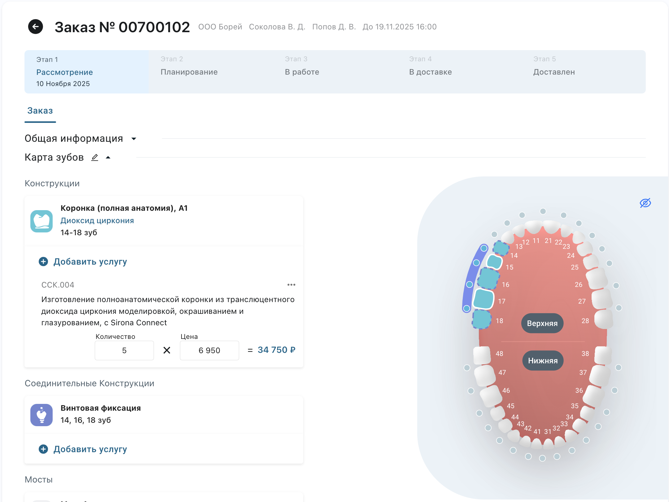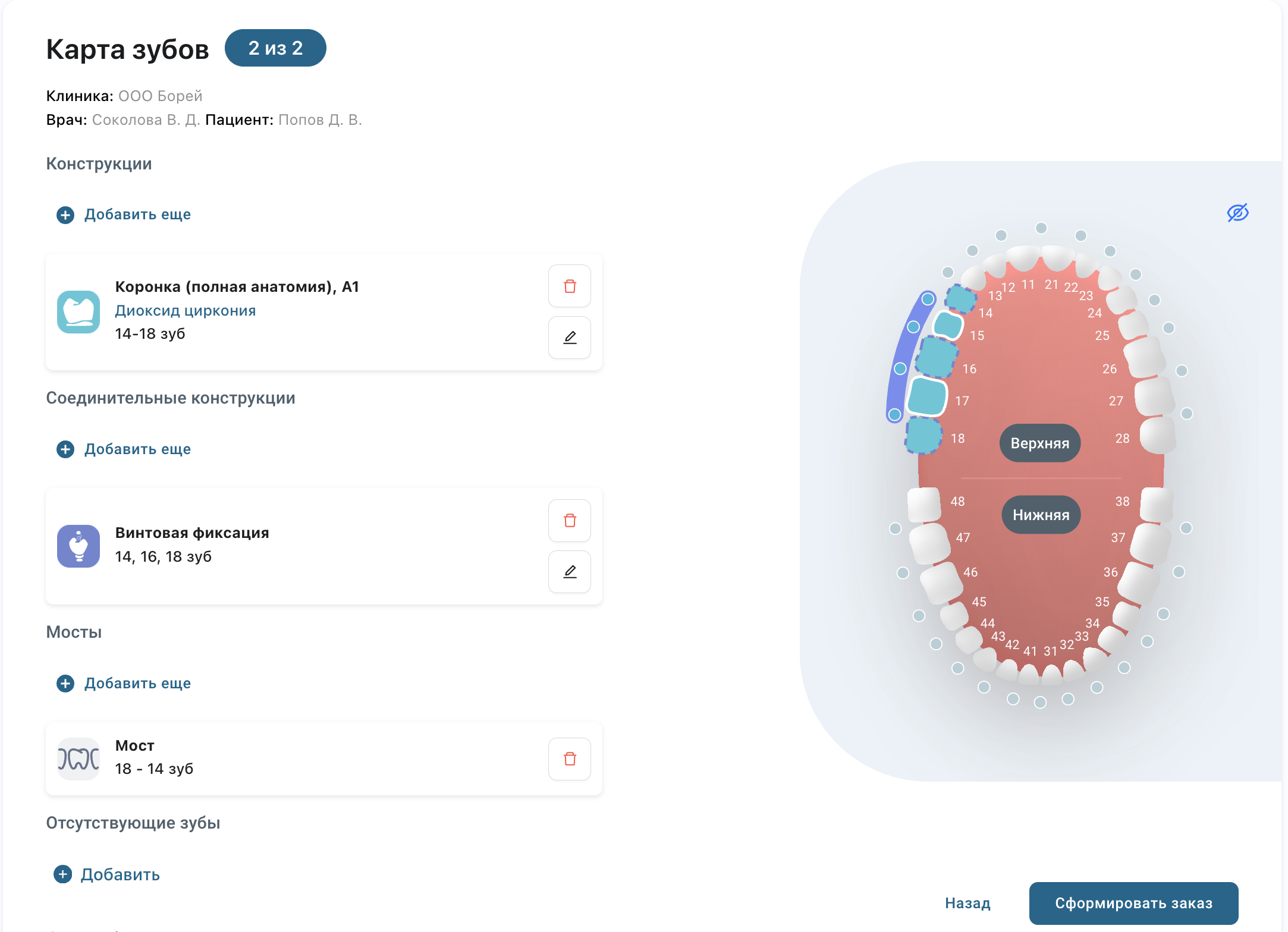 Конструкция появится в списке слева и отобразится на карте зубов.